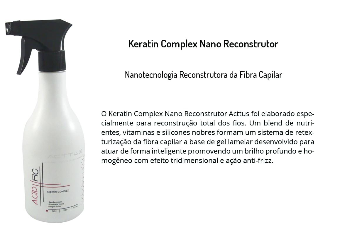 O Keratin Complex Nano Reconstrutor Acttus foi elaborado especialmente para reconstrução total dos fios. Um blend de nutrientes, vitaminas e silicones nobres formam um sistema de retexturização da fibra capilar a base de gel lamelar desenvolvido para atuar de forma inteligente promovendo um brilho profundo e homogêneo com efeito tridimensional e ação anti-frizz.