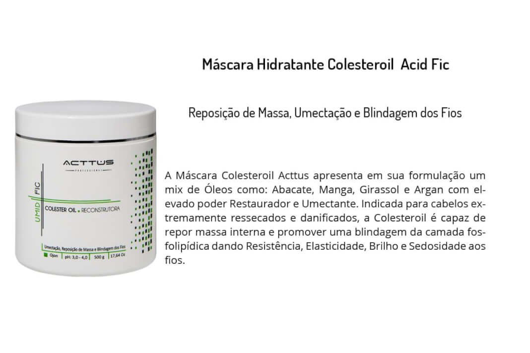 A Máscara Colesteroil Acttus apresenta em sua formulação um mix de Óleos como: Abacate, Manga, Girassol e Argan com elevado poder Restaurador e Umectante. Indicada para cabelos extremamente ressecados e danificados, a Colesteroil é capaz de repor massa interna e promover uma blindagem da camada fosfolipídica dando Resistência, Elasticidade, Brilho e Sedosidade aos fios.