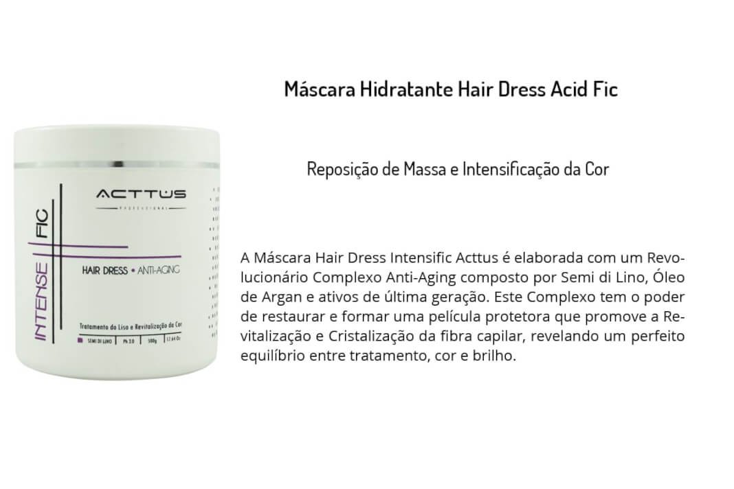 A Máscara Hair Dress Intensific Acttus é elaborada com um Revolucionário Complexo Anti-Aging composto por Semi di Lino, Óleo de Argan e ativos de última geração. Este Complexo tem o poder de restaurar e formar uma película protetora que promove a Revitalização e Cristalização da fibra capilar, revelando um perfeito equilíbrio entre tratamento, cor e brilho.