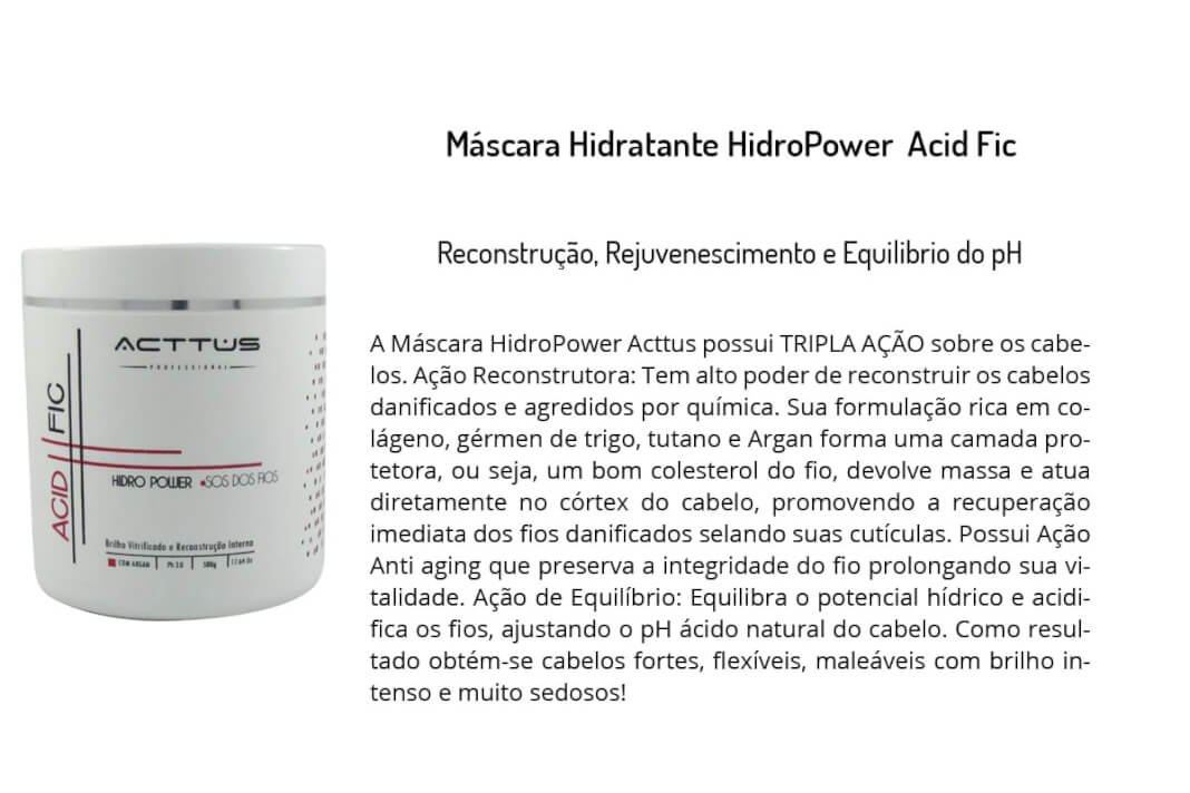 A Máscara HidroPower Acttus possui TRIPLA AÇÃO sobre os cabelos. Ação Reconstrutora: Tem alto poder de reconstruir os cabelos danificados e agredidos por química. Sua formulação rica em colágeno, gérmen de trigo, tutano e Argan forma uma camada protetora, ou seja, um bom colesterol do fio, devolve massa e atua diretamente no córtex do cabelo, promovendo a recuperação imediata dos fios danificados selando suas cutículas. Possui Ação Anti aging que preserva a integridade do fio prolongando sua vitalidade. Ação de Equilíbrio: Equilibra o potencial hídrico e acidifica os fios, ajustando o pH ácido natural do cabelo. Como resultado obtém-se cabelos fortes, flexíveis, maleáveis com brilho intenso e muito sedosos!