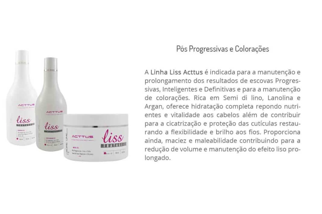 A Linha Liss Acttus é indicada para a manutenção e prolongamento dos resultados de escovas Progressivas, Inteligentes e Definitivas. Rica em Semi di lino, Lanolina e Argan, oferece hidratação completa repondo nutrientes e vitalidade aos cabelos além de contribuir para a cicatrização e proteção das cutículas restaurando a flexibilidade e brilho aos fios. Proporciona ainda, a Revitalização e Cristalização da fibra capilar, revelando um perfeito equilíbrio entre tratamento, cor e brilho.