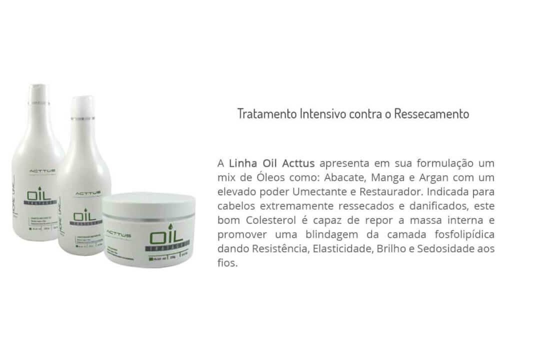 A Linha Oil Acttus possui um elevado poder restaurador e umectante. É capaz de repor a massa interna e promover uma blindagem da camada fosfolipídica dando resistência, elasticidade, brilho e sedosidade aos fios.